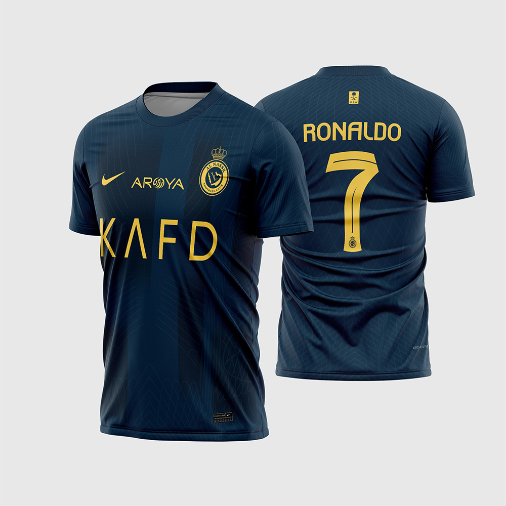 Primeiramente, a combinação de cores é impecável. Visto que utilizamos o Azul Marinho como base, os logotipos, patrocinadores (“KAFD”, “AROYA”) e o escudo do clube em Dourado Monocromático ganham um destaque brilhante e sofisticado. O corpo da camisa possui uma textura de micro-linhas verticais que adiciona um acabamento profissional à peça.