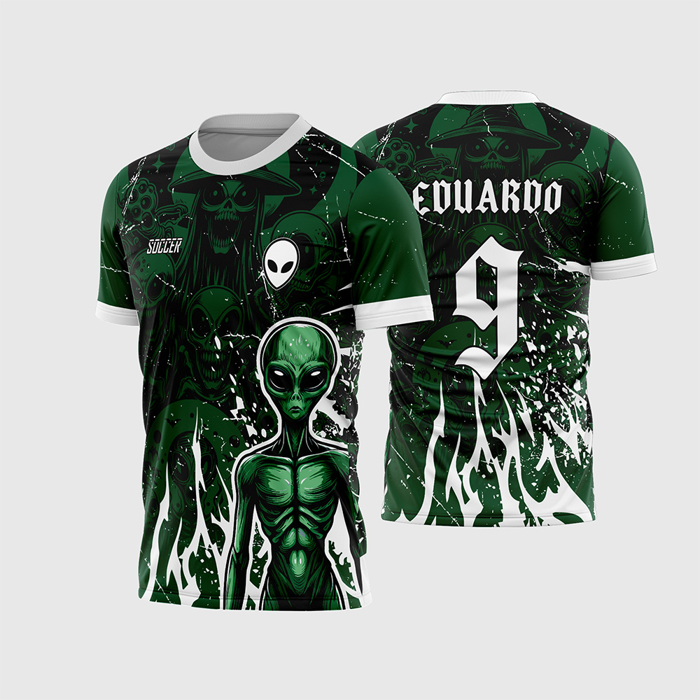 Primeiramente, o destaque visual é intergaláctico. O contraste do fundo escuro (espaço) com o verde vibrante do alienígena garante que sua turma seja vista de longe. Isso significa que vocês terão o uniforme mais moderno e “chamativo” do campeonato, perfeito para quem gosta de se diferenciar.