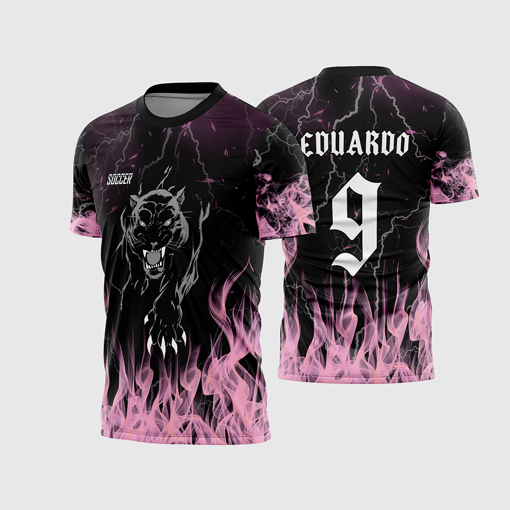 Primeiramente, o contraste é o grande diferencial. A base preta faz com que os detalhes em “Fogo Rosa” saltem aos olhos, criando um efeito neon vibrante na sublimação. Isso significa que sua equipe terá um uniforme moderno, fotogênico e com uma identidade visual forte, ideal tanto para times femininos quanto para turmas mistas descoladas.
